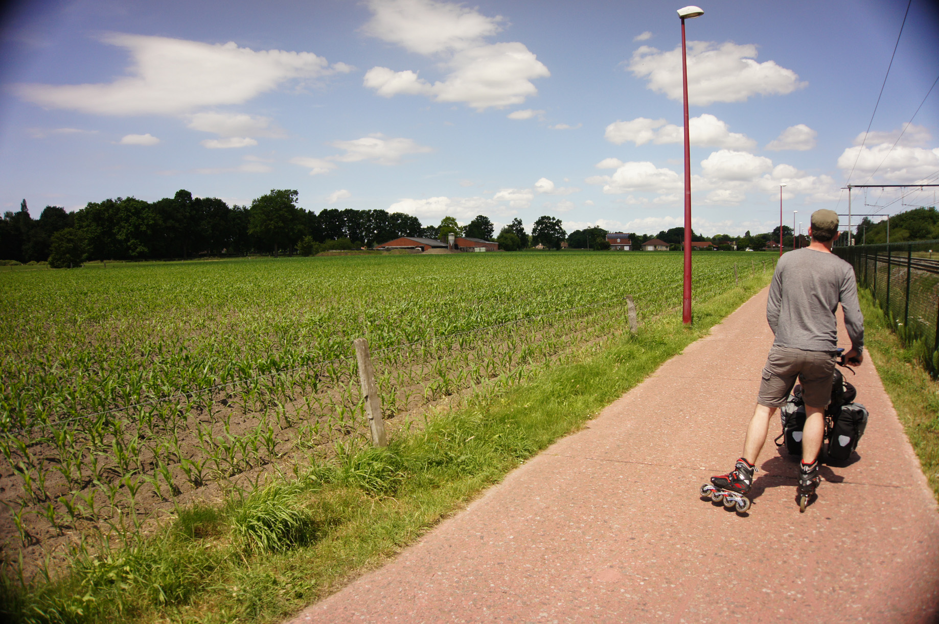 Première virée en “Roller-camping” pour tester l’itinérance en Skatedrive, cet accessoire qui doit nous permettre d’être autonome sur les roulettes en transportant couchages/affaires/etc… (plus d’infos).